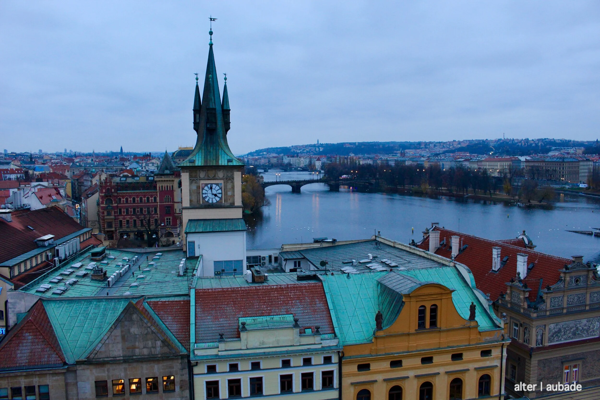 my favorite photo of prague taken at blue hour, from a tower on charles bridge.